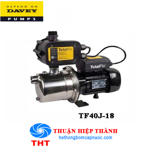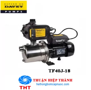 Máy bơm tăng áp điện tử Davey TOTALFLO JET TF40J-18 là tăng áp hoạt động nhẹ nhàng êm ái. Thường được sử dụng tại các hộ gia đình, khu chung cư, tòa nhà cao tầng, nơi có nguồn nước yếu nhằm tăng áp lực nước. Được sử dụng nguồn điện 220V với công suất 370W, tiết kiệm điện. Cột áp của dòng bơm tự động này có độ cao 35m. Lưu lượng nước tối đa 40 lit/phút. Máy bơm tăng áp được sản xuất bởi hãng bơm Davey có xuất xứ: Úc. Quý khách hàng sẽ được bảo hành 12 tháng và cung cấp đầy đủ giấy tờ khi mua hàng tại Công ty TNHH Thuận Hiệp Thành.